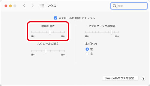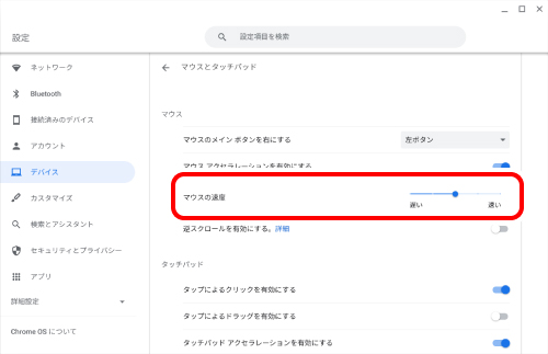 4) 「マウスの速度」のスライダーを使ってマウスポインターの速度を調整します。