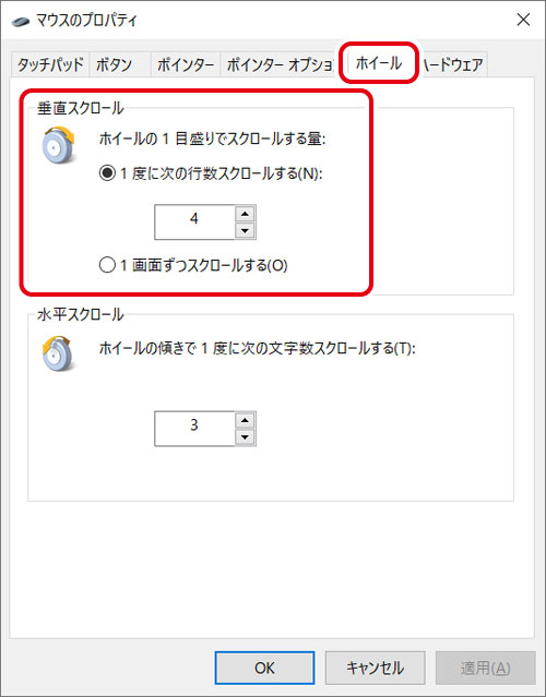 3) 「ホイールの1⽬盛りでスクロールする量」の「1度に次の⾏数スクロールする」の数値を変更します。