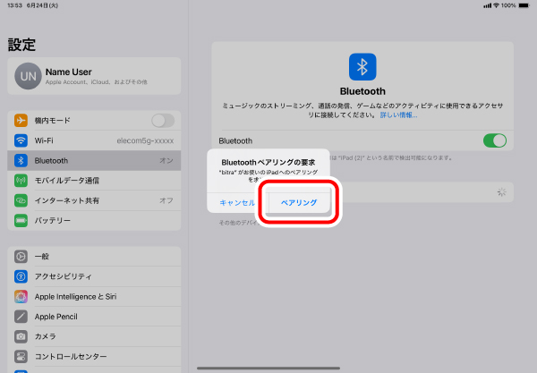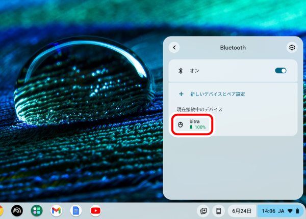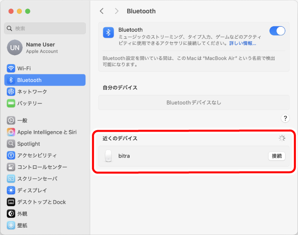 4)と同じ手順で[Bluetooth]をクリックし、「現在接続中のデバイス」に「bitra」が表示されていればペアリング完了です。