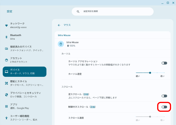 「逆スクロール」をオンにすると、ホイールの上下と逆方向にスクロールします。