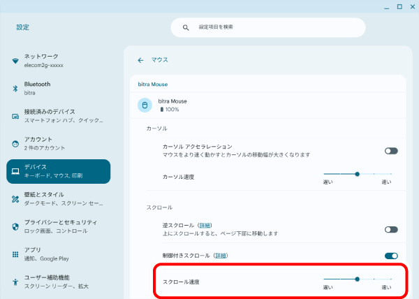 4) 本製品の「カーソル速度」のスライダーを使ってマウスポインターの速度を調整します。