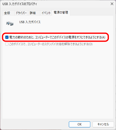 4) 「USB入力デバイスのプロパティ」画面で「電源の管理」タブをクリックします。