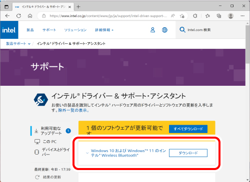 8) ブラウザでインテル社のサポートページが自動で開き、お使いのパソコンで更新可能なドライバーとソフトウェアの一覧が表示されます。