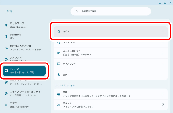 2) [Bluetoothとデバイス]をクリックし、[マウス]をクリックします。