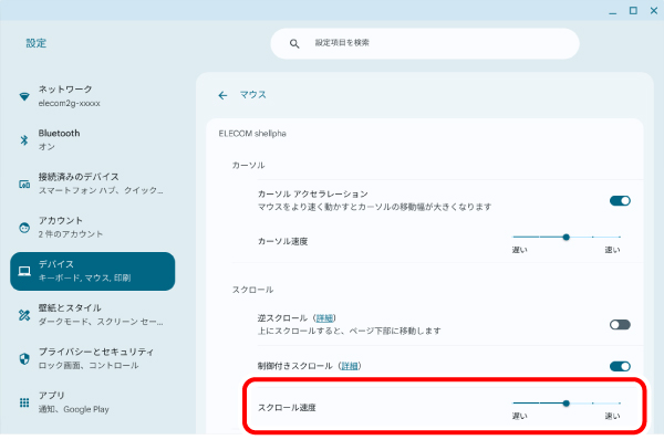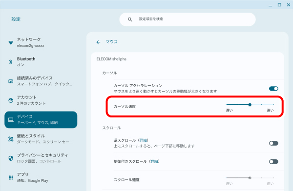 4) 「ELECOM shellpha」の「カーソル速度」のスライダーを使ってマウスポインターの速度を調整します。