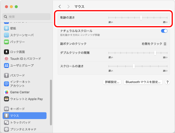 3) 「マウスポインターの速度」のスライドバーでマウスポインタ―の移動速度を調整します。