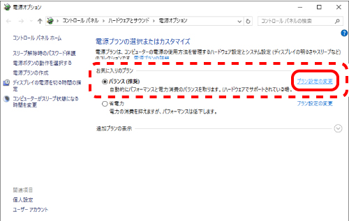 2) 「電源プラン」で選択している項目右側の「プラン設定の変更」をクリックします。