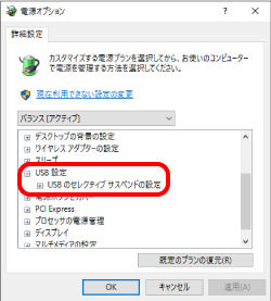 4) 「電源オプション」画面で、一覧から「USB設定」の「+」マークをクリックし、「USBのセレクティブ サスペンドの設定」の「+」マークをクリックします。