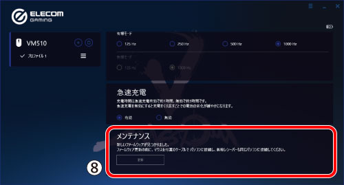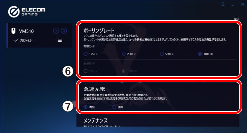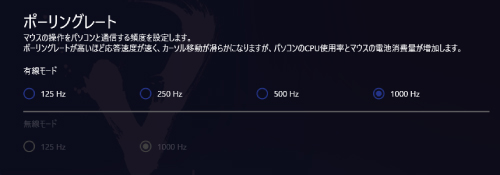 ポーリングレートとは、マウスがパソコンと通信する頻度を周波数(Hz)で示したものです。ポーリングレートが高いほど応答速度が速く、カーソル移動が滑らかになりますが、パソコンのCPU使用率とマウスの電池消費量が増加します。