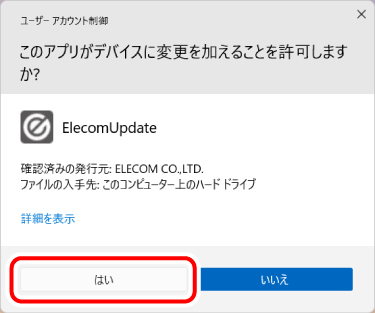 3) 「ユーザーアカウント制御」画⾯が表⽰されたときは、[はい]ボタンをクリックします。