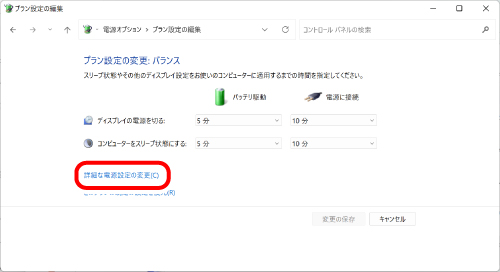 3) 「プラン設定の編集」画面で、「詳細な電源設定の変更」をクリックします。