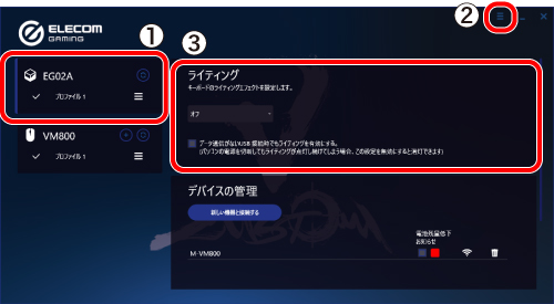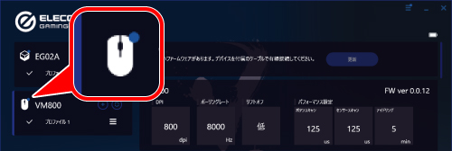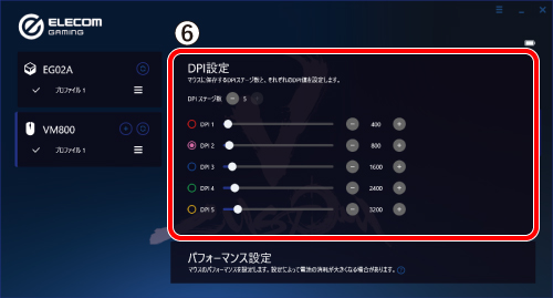詳しくは、「ELECOM GAMING Tool(EG Tool)で設定する」-「ゲーミングマウス VM800/VM800Lを設定する」-「DPIステージを設定する」をご覧ください。