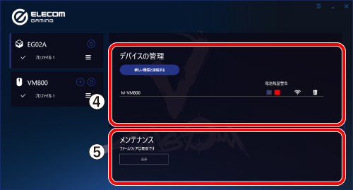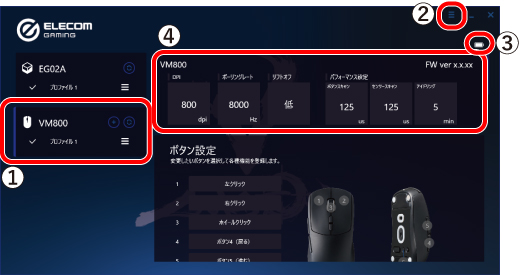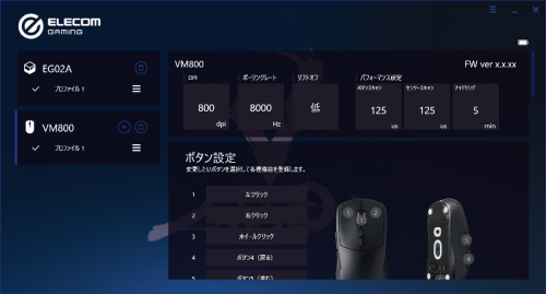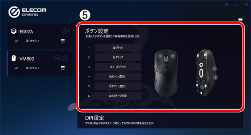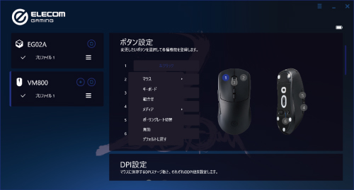 詳しくは、「ELECOM GAMING Tool(EG Tool)で設定する」-「ゲーミングマウス VM800/VM800Lを設定する」-「ボタンの機能を設定する」をご覧ください。