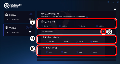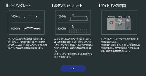 「ポーリングレート」「ボタンスキャンレート」「アイドリング時間」を設定すると、マウスとパソコンの通信速度や左右クリックの検出時間、マウスがスリープモードになるまでの時間などを設定できます。設定値によっては電池の消費量が増加します。