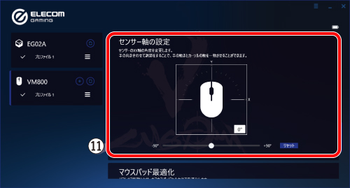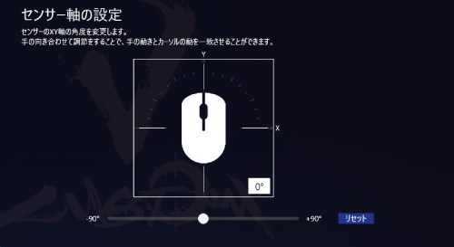 センサーのXY軸の角度を調整します。画面に表示されているマウスの向きが、実際のマウスの向きと同じになるように調整してください。