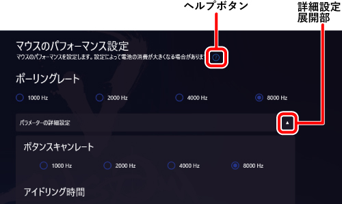 「パラメーターの詳細設定」の▼をクリックすると「ボタンスキャンレート」と「アイドリング時間」が表示され、マウスの詳細な設定ができます。