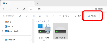 2) メモリーカードが割り当てられたUSBドライブを選択して、エクスプローラーの[取り出す]をクリックします。