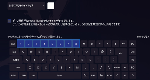 チェックボックスをオンにすると、充電機能のあるUSBポートやUSBハブに接続したときにパソコンをシャットダウンやスリープモードにしてもライティングを光らせることができます。