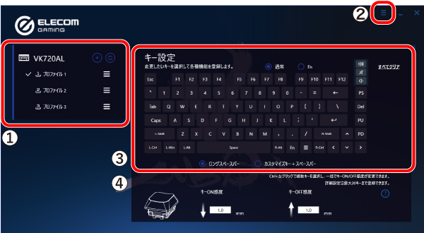 ※キーの機能や配置は自由に設定することができます。詳しくは「ELECOM GAMING Tool(EG Tool)で設定する」-「キーの機能を設定する」-「