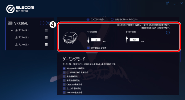 ゲーミングモードについては、「ELECOM GAMING Tool(EG Tool)で設定する」-「ゲーミングモードを設定する」をご覧ください。