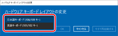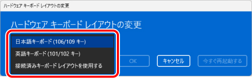 6) 「ハードウェア キーボードレイアウトの変更」画面で表示されたプルダウンから、「日本語キーボード(106/109キー)」を選択し、「今すぐ再起動する」をクリックして、パソコンを再起動します。